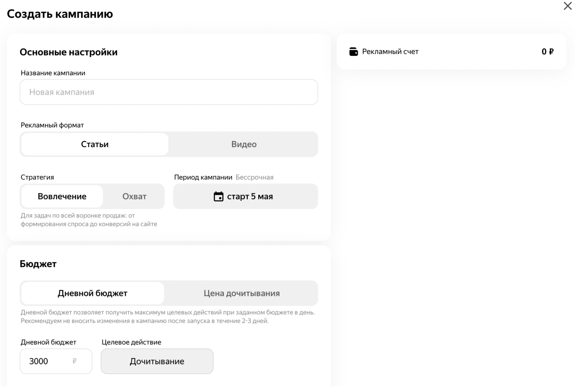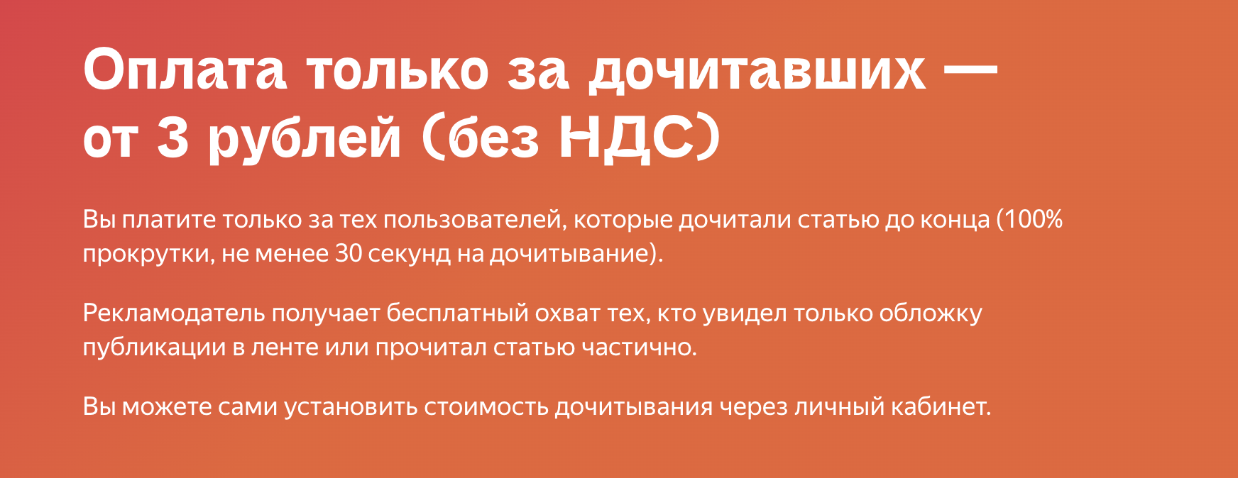 В Дзене есть рекламный кабинет, вы можете делать рекламные статьи и для них не нужно на регулярной основе вести канал. Это только реклама, такие статьи платные — цена зависит от количества показов, с них трафик тоже перегоняют на лендинг. По сути вы покупаете дочитывания своей статьи